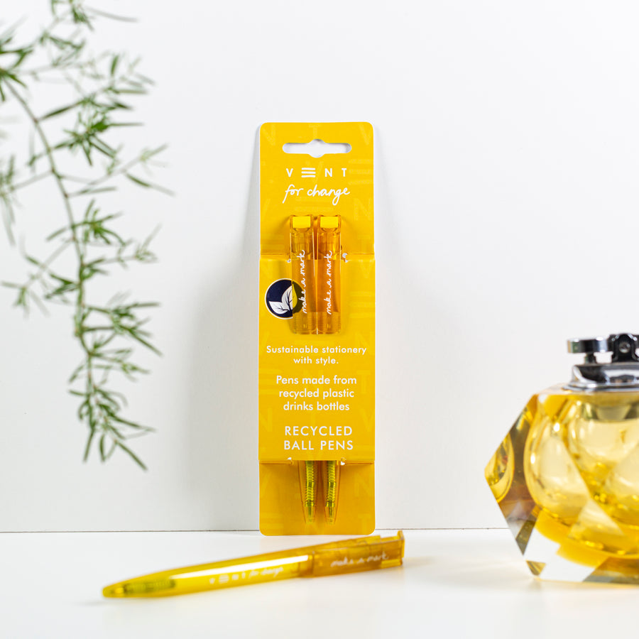 Stand out while making a difference with the "Make a Mark" recycled pens in vibrant yellow. Crafted from recycled drinks bottles, these eco-friendly pens are perfect for those who want to add a pop of color to their writing while supporting sustainability. Ideal for everyday use, they offer a smooth writing experience and a stylish way to make your mark.